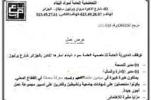 إعلان عن توظيف التعاضدية العامة لمواد البناء ads تعلن المديرية العامة للتعاضدية العامة لمواد البناء الكائن مقرها ب شارع الإخوة مروان (برليوز سابقا)، الجزائر الوسطى، الجزائر العاصمة عن توظيف في الرتب التالية: ✓ مدير الصحة : 01 ✓ مدير الإدارة و المالية : 01 …