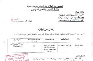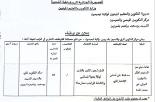 اعلان عن توظيف مركز التكوين المهني والتمهين بشروين تيميمون ads تعلن مركز التكوين المهني والتمهين بشروين تيميمون فتح مسابقة توظيف في الرتب المبينة ادناه عامل مهني من المستوى الاول عدد المناصب 02 منصب نمط التوظيف: مسابقة على اساس الاختبار المهني ملف مسابقة على اساس …