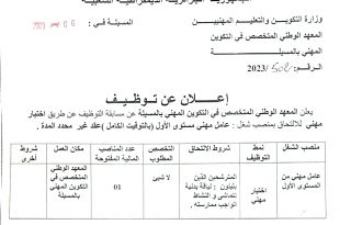 اعلان عن توظيف المعهد الوطني المتخصص في التكوين المهني المسيلة ads تعلن المعهد الوطني المتخصص في التكوين المهني المسيلة فتح مسابقة توظيف في الرتب المبينة ادناه عامل مهني من المستوى الاول عدد المناصب 02 منصب نمط التوظيف: مسابقة على اساس الاختبار المهني ملف مسابقة …