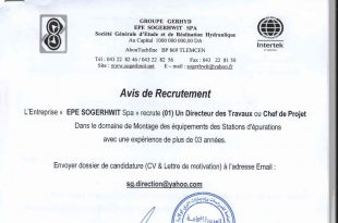 GROUPE GERHYD EPE SOGERHWIT SPA الشركة العامة للدراسات و انجازات الري سوجارويت اعلان عن توظيف ads هاتف: 043.22.82.46/043.22.82.56فاكس: 043.22.81.50الموقع الإلكتروني: www.sogerhwit.net البريد الإلكتروني: [email protected] تقوم شركة “EPE SOGERHWIT Spa” بتعيين (01) مدير أعمال أو مدير مشروعفي مجال تجميع معدات محطات معالجة مياه الصرف الصحيمع …
