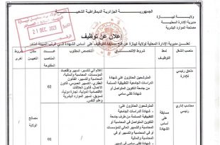 اعلانات توظيف الولايات المعنية: المدية، البليدة، جيجل، وهران، غليزان، مستغانم، تيسمسيلت، بجاية، ميلة، الوادى، الجلفة باتنة ورقلة تقرت عين قزام معسكر خنشلة البيض برج باجى مختار وام البواقى يرجى من المهتمين التقرب من الادارة المعنية بالعرض او الملحقة المحلية للتشغيل حسب طبيعة الاعلان ads …