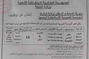 الديمقراطية الشعبية وزارة الصحة والسكان وإصلاح المستشفيات المؤسسة العمومية الاستشفائية تماسين ads إعلان عن توظيف تعلن المؤسسة العمومية الاستشفائية تماسين توقرت عن فتح مسابقات للتوظيف في الرتب المبينة أدناه: التخصص المطلوبمكان العملعدد المناصبنمط التوظيفشروط الالتحاقطبيب عام في الصحة العموميةالمؤسسة العمومية الاستشفائية …14على أساس الشهادةشهادة …