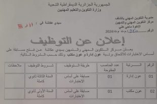 الجمهورية الجزائرية الديمقراطية الشعبية وزارة التكوين والتعليم المهنيين مديرية التكوين المهني بالشلف مركز التكوين المهني والتمهين ب… ads إعلان عن توظيف يعلن مركز التكوين المهني والتمهين ب… عن فتح مسابقة على أساس الاختبارات للالتحاق برتبة عون إدارة وعون مكتب وذلك حسب الشروط التالية: اعلانات …