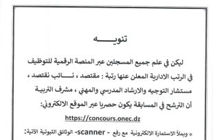 تنويه ads ليكن في علم جميع المسجلين عبر المنصة الرقمية للتوظيف في الرتب الإدارية المعلن عنها رتبة: مقتصد، نائب مقتصد، مستشار التوجيه والإرشاد المدرسي والمهني، مشرف التربية أن الترشح في المسابقة يكون حصريًا عبر الموقع الإلكتروني: https://concours.onec.dz وبملء الاستمارة الإلكترونية مع رفع (scan) الوثائق …