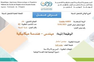 الملحقة المحلية للتشغيل المسيلة عرض عمل شركة كوسيدار Cosider Alrem ads تعلن الملحقة المحلية للتشغيل المسيلة عن عرض عمل بشركة كوسيدار Cosider Alrem كما هو موضح ادناه الهيئة المستخدمة شركة كوسيدار Cosider Alrem المناصب المطلوبة مهندس ميكانيك 02ميكانيك الاليات 02 نوع العقد محدد المدة …