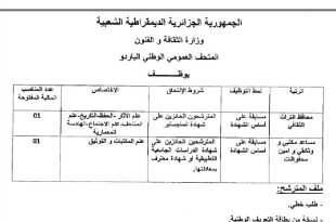 اعلان عن توظيف اعلانات توظيف بالولايات التالية الجزائر العاصمة، الجلفة، بشار، ام البواقي، سطيف، تبسة التفاصيل كاملة مرفقة ادناه المتحف العمومي الوطني الباردو بالعاصمة ads يعلن المتحف العمومي الوطني الباردو عن فتح مسابقة توظيف على اساس الشهادة في الرتب المبينة ادناه محافظ التراث الثقافي …