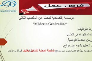 الوكالة الوطنية للتشغيل ads فرص عمل مؤسسة إقتصادية تبحث عن المنصب التالي: Médecin Généraliste شروط التوظيف: شهادة دكتوراه في الطب. معفى من الخدمة الوطنية. مكان العمل: بلدية عين فراح. فعلى المهتمين بهذا الإعلان التقرب من مصالح الملحقة المحلية للتشغيل تيغنيف في أقرب الآجال. مديرية …