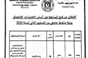 أكمل القراءة »إعلان عن مسابقة على أساس الاختبارات للالتحاق برتبة منشط جامعي من المستوى الثاني لسنة 2025