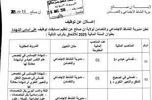 مديرية النشاط الاجتماعي والتضامن ولاية المسيلة ads إعلان عن توظيف تعلن مديرية النشاط الاجتماعي والتضامن لولاية المسيلة عن فتح مسابقة التوظيف للالتحاق بالرتب المبينة أدناه. آجال الطعون مفتوحة في حدود ثلاثة وعشرين (23) يوم عمل ابتداء من تاريخ إجراء المسابقة. تودع ملفات الترشح على …