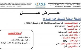 عرض عمل في المؤسسة العمومية لأشغال الطرق للوسط EPTRC