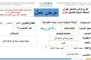الوكالة الوطنية للتشغيل الفرع الولائي سوق أهراس الملحقة المحلية للتشغيل سدراتة ads عرض عمل تعلن الملحقة المحلية للتشغيل سدراتة عن توظيف على مستوى الديوان الوطني للسقي وصرف المياه – وحدة قصر الصبيحي كما هو مبين ادناه: الهيئة المستخدمة: الديوان الوطني للسقي وصرف المياه – …