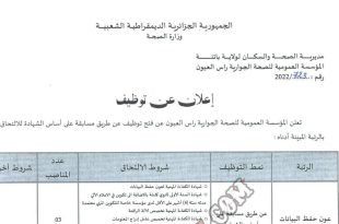 اعلان عن توظيف المؤسسة العمومية للصحة الجوارية راس العيون باتنة ads تعلن المؤسسة العمومية للصحة الجوارية راس العيون بولاية باتنة عن فتح مسابقة توظيف على اساس الشهادة بعنوان سنة 2022 للالتحاق بالرتبة التالية عون حفظ البيانات عدد المناصب : 03 نمط التوظيف على اساس …