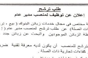طلب ترشح ads اعلان عن توظيف لمنصب مدير عام يعلن فرع هام في قطاع المالية مختص في مجال خدمات زبائن البنوك بيع تركيب وصيانة محطات الدفع الالكتروني والخدمات ذات الصلة عن طلب ترشح لمنصب مدير عام تاريخ نشر الاعلان في الجرائد 26 ماي 2022 …