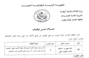 اعلان عن توظيف مديرية المصالح الفلاحية لولاية المسيلة ads تعلن مديرية المصالح الفلاحية لولاية المسيلة عن فتح مسابقة توظيف في الرتب المبينة ادناه مهندس دولة في الزراعة عدد المناصب 01 منصب نمط التوظيف: مسابقة على اساس الشهادة ملف المسابقة على أساس الشهادة طلب خطي …