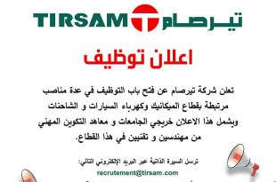 TIRSAM تيــرصــام TIRSAM اعلان توظيف ads تعلن شركة تيرصام عن فتح باب التوظيف في عدة مناصب مرتبطة بقطاع الميكانيك وكهرباء السيارات و الشاحنات و يشمل هذا الاعلان خريجي الجامعات و معاهد التكوين المهني من مهندسين و تقنيين في هذا القطاع. ترسل السيرة الذاتية عبر …