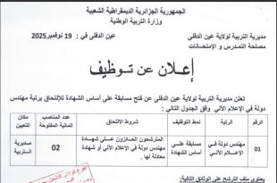 وزارة التربية الوطنية مديرية التربية لولاية عين الدفلى مصلحة التمدرس و الإمتحانات عين الدفلى في: 19 نوفمبر 2025 ads إعــلان عن توظيـف تعلن مديرية التربية لولاية عين الدفلى عن فتح مسابقة على أساس الشهادة للإلتحاق بمختلف الرتب وفق الصور التالية: تُعلن وزارة الشباب عن …
