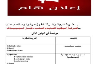 إعلان هام ads يعلن الفرع الولائي للتشغيل عن توفر مناصب عليا بالشركة الوطنية للحديد والصلب – غار الجبيلات – موضحة كالآتي: مدير منجم الشروط المطلوبة: 01-Spécialité Mine 02-Bac+5 03-Expérience 05 ans مدير الوحدة الأولية للمعالجة الشروط المطلوبة: 01/Spécialité: 1-Traitement de minerais 2-génie des procédés …