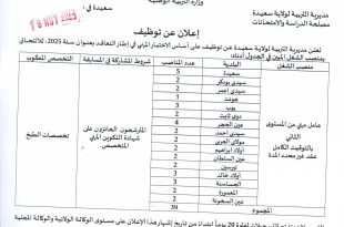 وزارة التربية الوطنية مديرية التربية لولاية سعيدة مصلحة الدراسة والامتحانات. في سعيدة بتاريخ 19 نوفمبر 2025. ads اعلان عن توظيف تعلن مديرية التربية لولاية سعيدة عن توظيف على أساس الاختبار المهني في إطار التعاقد بعنوان سنة 2025، للالتحاق بمناصب شغل: عمال مهنيين بعقد غير …
