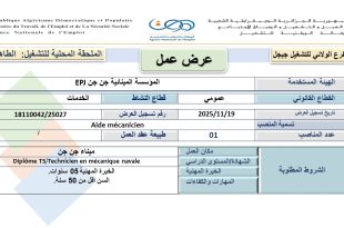 وزارة العمل والتشغيل والضمان الاجتماعي الوكالة الوطنية للتشغيل (ANEM) الملحقة المحلية للتشغيل: الطاهير الفرع الولائي للتشغيل جيجل ads عرض عمل الهيئة المستخدمة: المؤسسة المينائية جن جن EPJ القطاع القانوني: عمومي تاريخ تسجيل العرض: 2025/11/19 تسمية المنصبعدد المناصبالشهادة/المستوى الدراسي/الخبرة المهنيةمكان العملالسنMatelot Pont 07Diplôme matelot filière …
