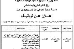 مسابقة توظيف بالمدرسة الوطنية العليا في علم النانو وتكنولوجيا النانو