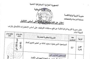 وزارة التربية الوطنية مديرية التربية لولاية تيسمسيلت ads إعلان عن توظيف تعلن مديرية التربية لولاية تيسمسيلت عن فتح مسابقة توظيف على أساس الاختبار المهني بعنوان 2025 لمناصب الشغل حسب ما هو مبين في الصور أدناه: اعلان عن مسابقة توظيف الإداريين بمديرية التربية اعلان توظيف …