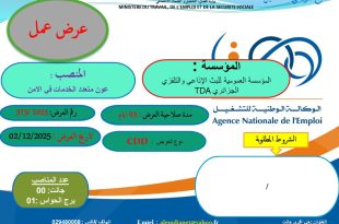 وزارة العمل والتشغيل والضمان الاجتماعي الوكالة الوطنية للتشغيل الملحقة المحلية للتشغيل – جانت ads عرض عمل المؤسسة: المؤسسة العمومية للبث الإذاعي والتلفزي الجزائري TDA المنصب: عون متعدد الخدمات في الأمن تاريخ العرض: 02 / 12 / 2025 مدة صلاحية العرض: 03 أيام نوع العرض: …