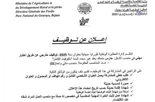وزارة الفلاحة والتنمية الريفية والصيد البحري المديرية العامة للغابات الحظيرة الوطنية لقورايا – بجاية – ads إعلان عن توظيف تنظم إدارة الحظيرة الوطنية لقورايا -بجاية- بعنوان سنة 2025، توظيف خارجي عن طريق اختبار مهني في منصب الشغل: حارس متعاقد بعقد غير محدد المدة “بالتوقيت …