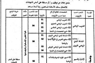 ملحق إعلان عن توظيف و / أو مسابقة على أساس الشهادات للالتحاق بسلك الأساتذة المساعدين، رتبة أستاذ مساعد ads المؤسسة المعنية: جامعة محمد لمين دباغين سطيف 2. الشعب حسب الأولويات: التدريب الرياضي: 01- التدريب الرياضي. 02- التدريب الرياضي النخبوي. 03- التدريب الرياضي التنافسي. 04- …