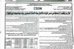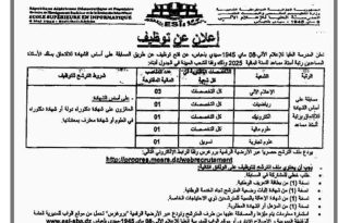 وزارة التعليم العالي والبحث العلمي المدرسة العليا في علوم وتكنولوجيات الإعلام الآلي والرقمنة – بجاية – ads الاثنين 29 ديسمبر 2025 م إعلان عن توظيف و / أو مسابقة على أساس الشهادات للالتحاق بسلك الأساتذة المساعدين، رتبة: أستاذ مساعد (دورة ثانية) تعلن المدرسة العليا …