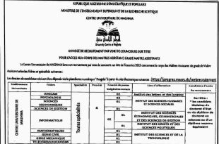 وزارة التعليم العالي والبحث العلمي ads المركز الجامعي لمغنية إعلان عن توظيف عن طريق المسابقة على أساس الشهادة للالتحاق بسلك الأساتذة المساعدين، رتبة أستاذ مساعد قسم “ب” يعلن المركز الجامعي لمغنية عن فتح باب التوظيف عن طريق المسابقة على أساس الشهادة للسنة المالية 2025 …