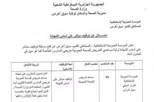 وزارة الصحة مديرية الصحة والسكان لولاية سوق أهراس المؤسسة العمومية الاستشفائية المستشفى القديم سوق أهراس ads إعـــلان عن توظيف مباشر على أساس الشهادة تعلن المؤسسة العمومية الاستشفائية – المستشفى القديم – سوق أهراس عن فتح مسابقة توظيف مباشر على أساس الشهادة لرتبة مساعدي التمريض …