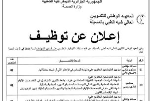 وزارة الصحة المعهد الوطني للتكوين العالي شبه الطبي بالمسيلة ads إعلان عن توظيف يعلن المعهد الوطني للتكوين العالي شبه الطبي بالمسيلة، عن فتح مسابقات للتوظيف الخارجي على أساس الشهادات لسنة 2025 في الرتب المبينة أدناه: الرقمالرتبةشروط الالتحاقعدد المناصب01مساعد مهندس مستوى 2 في الإعلام الآليمن …