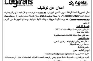 Logitrans Agefal ads إعلان عن توظيف تعلن المديرية العامة لوكالة تسيير الشحن الجزائر “AGEFAL”، فرع مجمع نقل البضائع واللوجستيك “LOGITRANS”، عن حملة توظيف لـ 450 سائق شاحنة نصف مقطورة (chauffeur semi-remorque)، خصوصا نقل المحروقات، وذلك لتلبية احتياجات وحداتها الموزعة عبر التراب الوطني. شروط الترشح: …