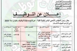 أكمل القراءة »إعلان عن توظيف بالمجلس الشعبي البلدي لبلدية القبة ولاية الجزائر