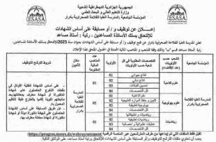 وزارة التعليم العالي والبحث العلمي المؤسسة الجامعية: المدرسة العليا للفلاحة الصحراوية بأدرار ads إعلان عن توظيف و/أو مسابقة على أساس الشهادات للإلتحاق بسلك الأساتذة المساعدين، رتبة: أستاذ مساعد قسم “ب” تعلن المدرسة العليا للفلاحة الصحراوية بأدرار عن فتح توظيف و/أو مسابقة على أساس الشهادات …