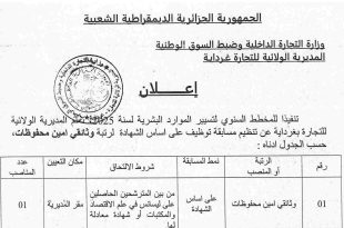 وزارة التجارة الداخلية وضبط السوق الوطنية المديرية الولائية للتجارة لغرداية ads إعلان تنفيذا للمخطط السنوي لتسيير الموارد البشرية لسنة 2025، تعلن المديرية الولائية للتجارة بغرداية عن تنظيم مسابقة توظيف على أساس الشهادة لرتبة وثائقي أمين محفوظات، حسب الجدول أدناه: رقمالرتبة أو المنصبنمط المسابقةشروط الالتحاقمكان …