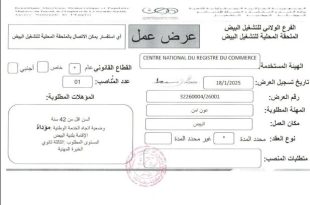 وزارة العمل والتشغيل والضمان الاجتماعي الوكالة الوطنية للتشغيل الفرع الولائي للتشغيل البيض الملحقة المحلية للتشغيل البيض ads عرض عمل الهيئة المستخدمة: CENTRE NATIONAL DU REGISTRE DU COMMERCE المركز الوطني للسجل التجاري القطاع القانوني: عام تاريخ تسجيل العرض: 18/1/2025 عدد المناصب: 01 المهنة المطلوبة: عون …