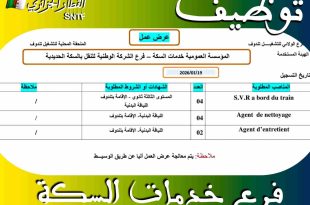 الملحقة المحلية للتشغيل تندوف توظيف ads عرض عمل الهيئة المستخدمة: المؤسسة العمومية لخدمات السكة – فرع الشركة الوطنية للنقل بالسكة الحديدية تاريخ التسجيل: 2026/01/19 المناصب المطلوبةالعددالشهادات أو الشروط المطلوبةملاحظةS.V.R a bord du train04المستوى الثالثة ثانوي – الإقامة بتندوف – اللياقة البدنية/Agent de nettoyage04اللياقة البدنية …