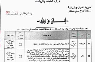 وزارة الشباب والرياضة ولاية البيض مديرية الشباب والرياضة مصلحة التكوين وإدارة الوسائل ads البيض في: 19 جانفي 2026 إعلان عن توظيف تعلن مديرية الشباب والرياضة لولاية البيض عن فتح توظيف عن طريق الانتقاء للالتحاق بمنصب شغل عامل مهني المستوى الأول محدد المدة بالتوقيت الكامل. …