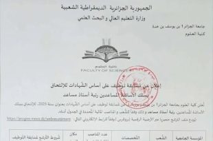 وزارة التعليم العالي والبحث العلمي جامعة الجزائر 1 بن يوسف بن خدة كلية العلوم ads إعلان عن مسابقة توظيف على أساس الشهادات للالتحاق بسلك الأساتذة المساعدين رتبة أستاذ مساعد تعلن كلية العلوم بجامعة الجزائر 1 بن يوسف بن خدة عن مسابقة توظيف على أساس …