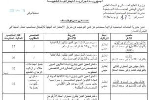 وزارة التعليم العالي والبحث العلمي الديوان الوطني للخدمات الجامعية مديرية الخدمات الجامعية بمستغانم ads مستغانم في: 19 جانفي 2026 إعلان عن توظيف تعلن مديرية الخدمات الجامعية لولاية مستغانم عن فتح التوظيف عن طريق الاختبارات المهنية للالتحاق بمناصب الشغل المبينة في الجدول أدناه: منصب الشغلنمط …