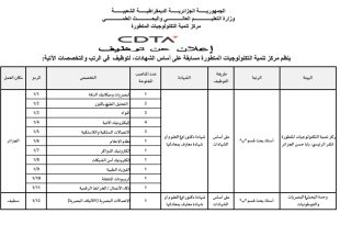 وزارة التكوين المهني معهد التكوين والتعليم المهني ورڨلة ads اعلان توظيف الولايات المعنية: عين قزام . ايليزي. توڨرت. الوادى.برج باجي مختار . عين صالح. غرداية. المغير. جانت.المنيعة . تيميمون . ادرار. تمنراست. ورقلة تاريخ النشر 29 جانفي 2026 وزارة الرياضة تعلن عن فتح مسابقات …