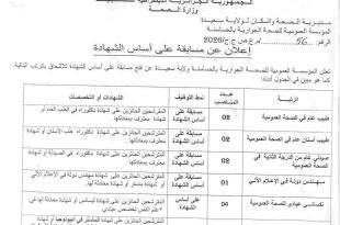 وزارة الصحة مديرية الصحة والسكان لولاية سعيدة المؤسسة العمومية للصحة الجوارية بالحساسنة ads إعلان عن مسابقة على أساس الشهادة تعلن المؤسسة العمومية للصحة الجوارية بالحساسنة ولاية سعيدة عن فتح مسابقة على أساس الشهادة للالتحاق بالرتب التالية كما هو مبين في الجدول أدناه: الرتبةعدد المناصبنمط …