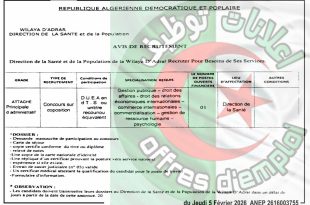 وزارة العمل والتشغيل والضمان الاجتماعي الوكالة الوطنية للتشغيل الفرع الولائي للتشغيل تندوف الملحقة المحلية للتشغيل أم العسل ads عرض عمل الهيئة المستخدمة: المؤسسة الوطنية للجيوفيزياء ENAGEO تاريخ التسجيل: 2026/02/02 المناصب المطلوبةالعددمكان العملالشهادات أو الشروط المطلوبةملاحظةManœuvre sismique25مشروع EGS-190– اللياقة البدنية– معرفة في مجال النظافة، الصحة …