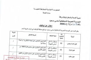وزارة الصحة مديرية الصحة والسكان لولاية ورقلة المؤسسة العمومية الاستشفائية حاسي مسعود ads إعلان عن توظيف يعلن السيد مدير المؤسسة العمومية الاستشفائية حاسي مسعود عن فتح مسابقة للتوظيف في الرتب المبينة أدناه: الرتبةعدد المناصب الماليةطريقة التوظيفشروط الالتحاقشروط أخرىعون إدارة رئيسي02مسابقة على أساس الشهادةالمترشحين الحائزين …