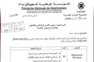 الفرع الولائي للتشغيل لولاية برج باجي مختار المؤسسة الوطنية للجيوفيزياء Entreprise Nationale de Géophysique ads حاسي مسعود في: 03 فيفري 2026 عرض عمل لنا الشرف بأن نقدم لكم عرض العمل الخاص بالتوظيف وبعقود محددة المدة، لمشروع (2026-FSG-2D) EGS-250 ولاية برج باجي مختار: المنصبالعددشروط التوظيفManoeuvre …