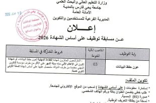 وزارة التعليم العالي والبحث العلمي جامعة يحي فارس بالمدية الأمانة العامة المديرية الفرعية للمستخدمين والتكوين ads إعلان عن مسابقة توظيف على أساس الشهادة 2026 رتبة التوظيفالمناصب المالية المفتوحةشروط المشاركة في المسابقةعون حفظ البيانات03المترشحون الحائزون شهادة الكفاءة المهنية لعون حفظ البيانات، أو شهادة تكوين في …