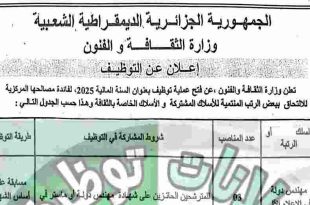 وزارة الثقافة و الفنون ads إعلان عن إجراء مسابقة توظيف تعلن وزارة الثقافة والفنون، عن فتح مسابقة للتوظيف على أساس الشهادات لفائدة المركز الإقليمي بالجزائر لصون التراث الثقافي غير مادي في افريقيا، من الفئة 2 تحت رعاية اليونسكو، في الرتبتين المبينتين في الجدول أدناه: …