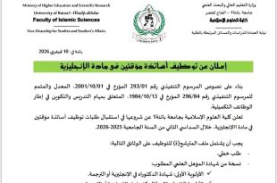 وزارة التعليم العالي والبحث العلمي جامعة باتنة 1 – الحاج لخضر كلية العلوم الإسلامية ads باتنة في: 10 فيفري 2026 إعلان عن توظيف أساتذة مؤقتين في مادة الإنجليزية بناء على نصوص المرسوم التنفيذي رقم 293/01 المؤرخ في 2001/10/01، المعدل والمتمم للمرسوم التنفيذي رقم 296/84 …