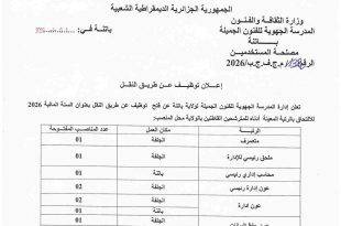 رئاسة الجمهورية عمادة جامع الجزائر المركز الثقافي لجامع الجزائر ads إعلان عن توظيف يعلن المركز الثقافي لجامع الجزائر عن فتح مسابقة للتوظيف على أساس الشهادات، للالتحاق بالرتب المبينة في الجدول أدناه: منصب الشغلنمط التوظيفشروط الالتحاقالتخصص المطلوبعدد المناصب المفتوحةمكان التعيينمتصرف محللمسابقة توظيف على أساس الشهادةشهادة …